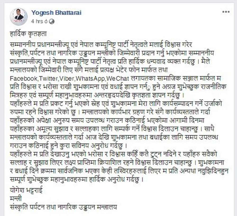 सम्माननीय प्रधानमन्त्रीज्यू एवं नेपाल कम्यूनिष्ट पार्टीको नेतृत्वले मलाई विश्वास गरेर संस्कृति, पर्यटन तथा नागरिक उड्डयन मन्त्रीको जिम्मेवारी प्रदान गर्नु भएकोमा सम्माननीय प्रधानमन्त्रीज्यू एवं नेपाल कम्यूनिष्ट पार्टी नेतृत्वप्रति हार्दिक धन्यवाद व्यक्त गर्दछु । मैले मन्त्रालयको जिम्मेवारी लिएसँगै मलाई प्रत्यक्ष भेटेर फोनमार्फत तथा फेसबुक, ट्वीटर, भाइबर, ह्वाटसएप, वीच्याटलगायतका सामाजिक सञ्जालमार्फत मप्रति विश्वास र भरोसा राखी शुभकामना एवं वधाई ज्ञापन गर्नु हुने अग्रज, शुभेच्छुक राजनीतिक मित्रहरु एवं सम्पूर्ण महानुभावहरुमा अन्तरहृदयदेखि कृतज्ञता ज्ञापन गर्दछु ।