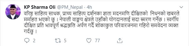 वरिष्ठ साहित्यकार दीक्षितको निधनले मर्माहत भएकाे छुः प्रधानमन्त्री ओली