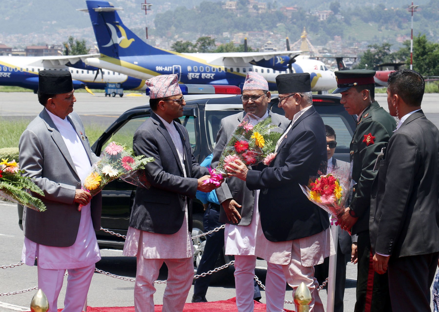 २० भदाै, काठमाडाैँ । स्वास्थ्य लाभ गरेर प्रधानमन्त्री केपी शर्मा ओली स्वदेश फर्किएका छन । उनी दिउँसो १२ बजे थाइ एयरवेजको उडानबाट त्रिभुवन अन्तर्राष्ट्रिय विमानस्थलमा अवतरण गरेका हुन । ओलीलाइ विमानस्थलमा स्वागत गर्न कार्यबहाक प्रधानमन्त्री इश्वर पोखरेल, सभामुख कृष्णबहादुर महरा, राष्ट्रियसभा अध्यक्ष गणेश तिमल्सिना लगायतका मन्त्रीहरुले विमानस्थलमा स्वागत गरे ।  विमानस्थलमा स्वागतका लागि उभिएका नेता कार्यकर्तालाई ओलीले मुस्कुराउदै अभिवादन गरे । तर प्रधानमन्त्रीले अाज सञ्चारकर्मीलाइ भने केही पनि प्रतिक्रिया दिएनन् ।