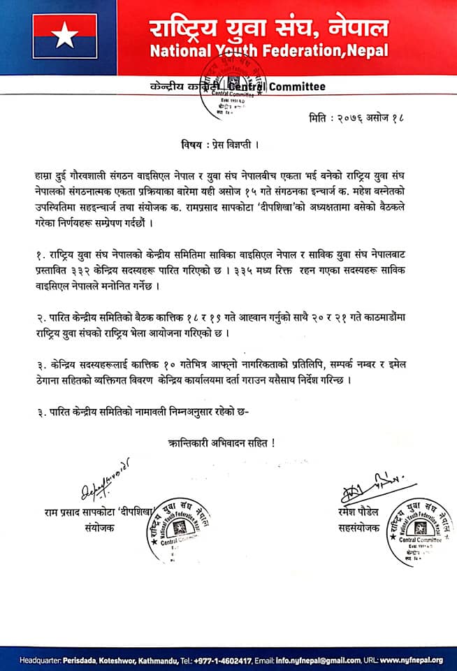 १८ असोज, काठमाडाैँ । नेपाल कम्युनिष्ट पार्टी (नेकपा)को भ्रातृ संगठन राष्ट्रिय युवा संघले पूर्णता पाएको छ । दशैँको मुखमा ३३१ जनाले राष्ट्रिय युवा संघ नेपालको केन्द्रीय सदस्यको जिम्मेवारी पाएका छन । तत्कालीन युवा संघ र वाइसीएल नेपालबीच एकीकरण भएर बनेको राष्ट्रिय युवा संघ नेपालले दुबै संगठनबाट प्रस्तावित केन्द्रीय सदस्यहरुको नामावली टुंगो लगाएर पारित गरेको हो ।