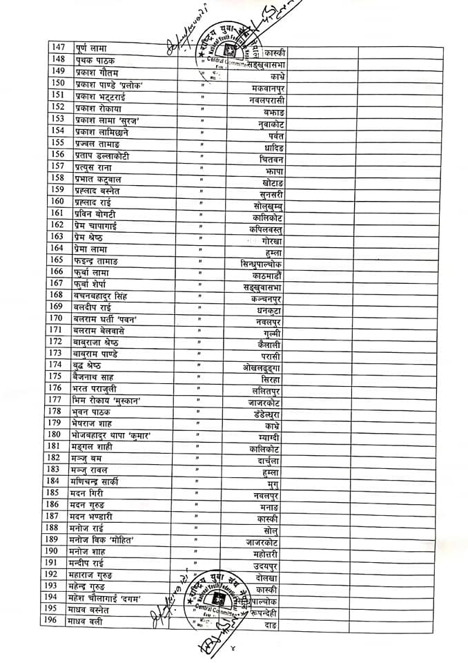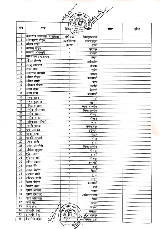 युवा संघका इन्चार्ज महेश बस्नेत, राष्ट्रिय युवा संघका संयोजक रामप्रसाद सापकोटा र सहसंयोजक रमेश पाैडेलले जिम्मेवारीको टुंगो लगाएका हुन । युवा संघले केन्द्रीय समितिको बैठक कात्तिको १८ र १९ गतेका लागि बोलाएको छ भने २० र २१ गते राष्ट्रिय भेला पनि तोकेको छ । यस्तो छ जिम्मेवारी पाउनेहरूको सूची ।