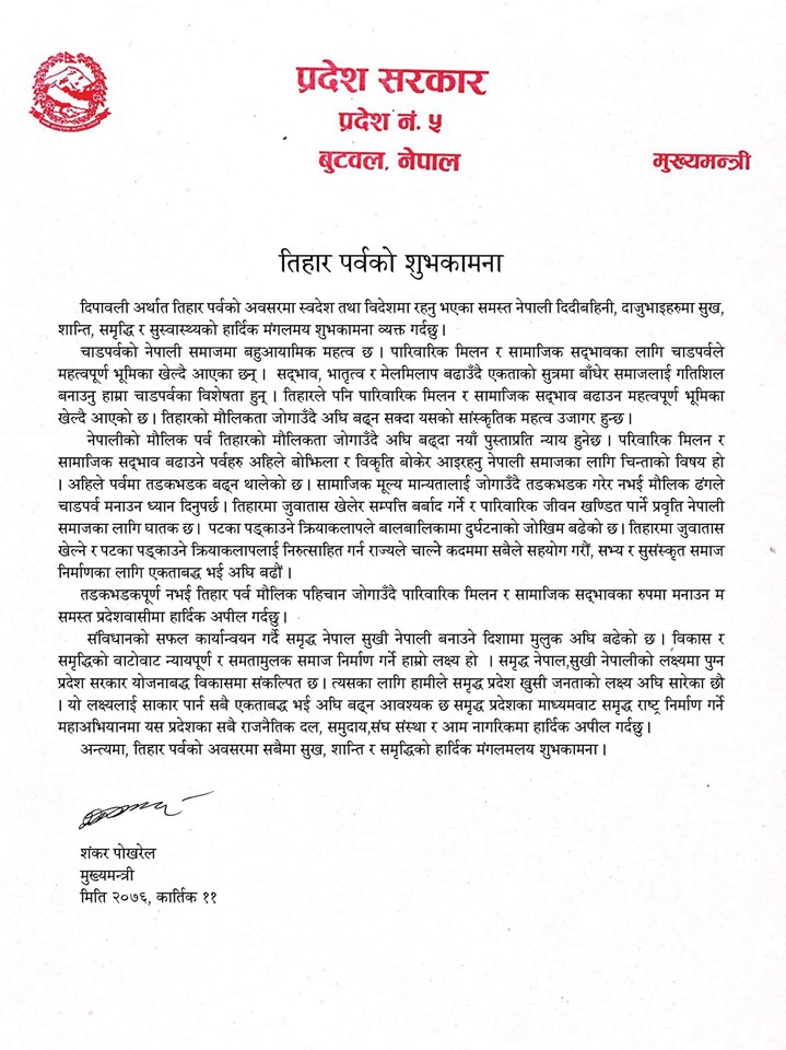 उनले स्वदेश तथा विदेशमा रहेक समस्त नेपाली दिदीबहिनी, दाजुभाइहरुमा सुख, शान्ति, समृद्धि र सुस्वास्थ्यको कामना गर्दै तिहारको मौलिकता जोगाउँदै अघि बढ्दा नयाँ पुस्ताप्रति न्याय हुने बताए । उनले भनेका छन ‘चाडपर्वको नेपाली समाजमा बहुआयामिक महत्व छ । पारिवारिक मिलन र सामाजिक सद्भावका लागि चाडपर्वले महत्वपूर्ण भूमिका खेल्दै आएका छन् । सद्भाव, भातृत्व र मेलमिलाप बढाउँदै एकताको सुत्रमा बाँधेर समाजलाई गतिशिल बनाउनु हाम्रा चाडपर्वका विशेषता हुन् । तिहारले पनि पारिवारिक मिलन र सामाजिक सद्भाव बढाउन महत्वपूर्ण भूमिका खेल्दै आएको छ । तिहारको मौलिकता जोगाउँदै अघि बढ्न सक्दा यसको सांस्कृतिक महत्व उजागर हुन्छ ।’
