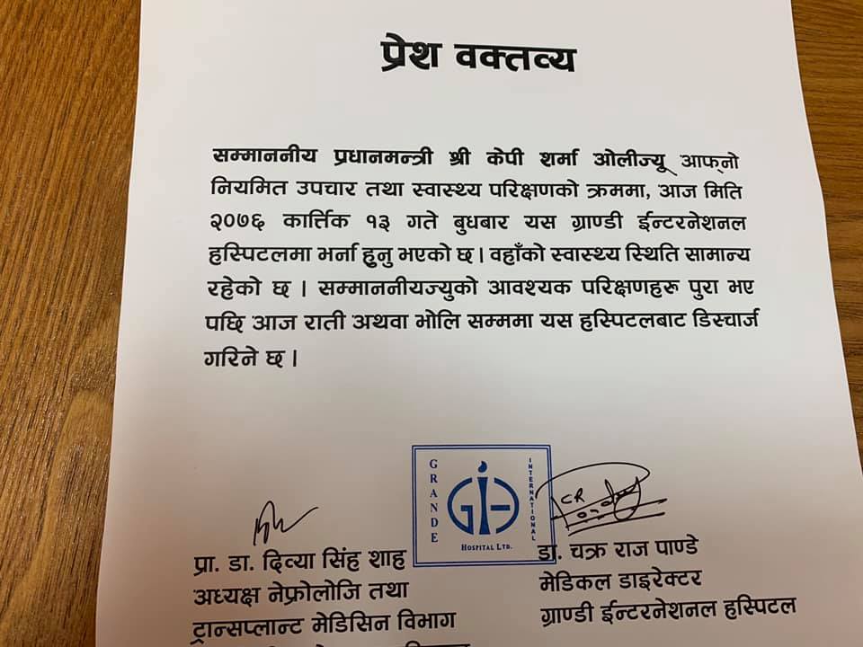 प्रधानमन्त्री अस्पताल भर्ना भएको जानकारी दिँदै अस्पतालले पहिलो विज्ञप्ति जारी गरेको छ । विज्ञप्ति अनुसार प्रधानमन्त्रीको स्वास्थ्यमा कुनै पनि समस्या रहेको छैन् । उहाँको अवस्था सामान्य रहेको छ। प्रधानमन्त्रीको स्वास्थ्य परीक्षण भोलिसम्म चल्न सक्ने प्रधानमन्त्रीको निजी चिकित्सक दिव्यासिंह  शाहले जानकारी दिनुभयो । १२ वर्षअघि मिर्गौला फेरेका ओलीले नियमित स्वास्थ्य परीक्षण गराउँदै आउनु भएको छ । भदौमा सिंगापुरमा प्लाज्मा फेरिसिस गरेर फर्किएपछि प्रधानमन्त्री ओलीले नियमित रूपमा ग्राण्डी अस्पतालमा स्वास्थ्य परीक्षण गराउँदै आउनुभएको छ । अस्पतालको प्रेस विज्ञप्ति तल हेर्न सक्नुहुन्छ ।