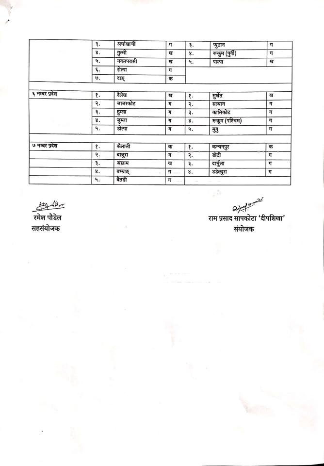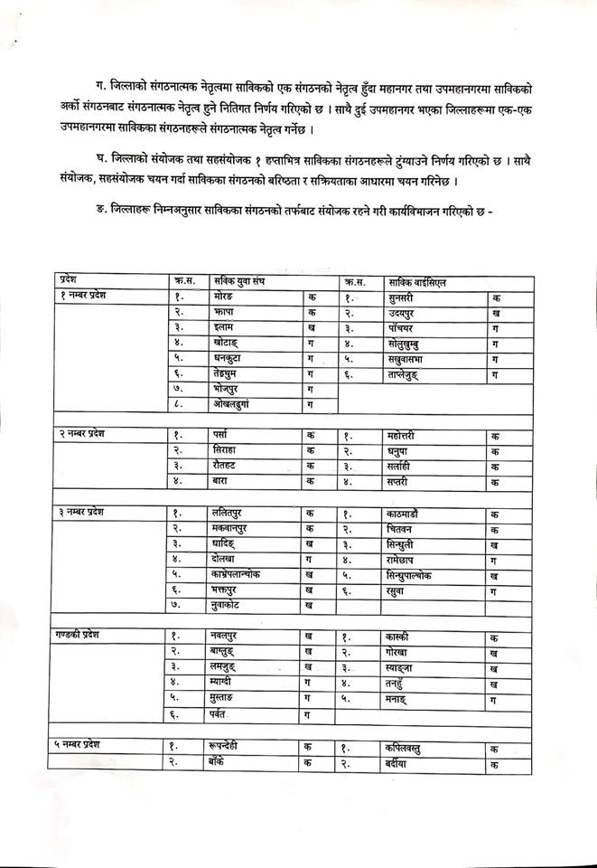 ७७ जिल्ला कमिटीमध्ये तत्कालीन एमालेनिकट युवा संघले ४२ जिल्ला अध्यक्ष पाउने भएको छ । त्यस्तै, साविक योङ कम्युनिस्ट लिग (वाईसीएल) ले ३५ जिल्लाको अध्यक्ष पाउने गरी सहमति भएको आइतबार जारी विज्ञप्तिमा उल्लेख छ । त्यस्तै, वाईसीएलले ४२ जिल्लाको इञ्चार्ज र युवासंघले ३५ जिल्लाको इञ्चार्ज पाएको छ । नेतृत्वको टुंगो वरिष्ठता र सक्रियताका आधारमा १ हप्ताभित्र लाग्ने बताइएकाे छ । त्यसैगरी, संघले कात्तिक ३० गते समितिको बैठक र मंसिर १ मा राष्ट्रिय भेला बोलाउने निर्णय पनि गरेको छ ।