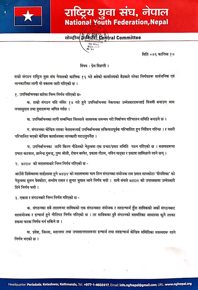 संघले उपनिर्वाचनका लागि किरण पौडेलको नेतृत्वमा प्रचार प्रसार समितिसमेत गठन गरेको छ । समितिमा प्रभात कटुवाल, ज्ञानेन्द्र गुरुङ, पुष्प ओली, रोशन बस्नेत, प्रकाश गौतम, नवीन खड्का र प्रकाश लामिछाने छन् । युवा संघले प्रदेश, जिल्ला, महानगर र उपमहानगरपालिका इञ्चार्ज तथा सहइञ्चार्जमा केन्द्रीय समितिका सदस्यहरूलाई पठाउने निर्णय गरेको छ ।