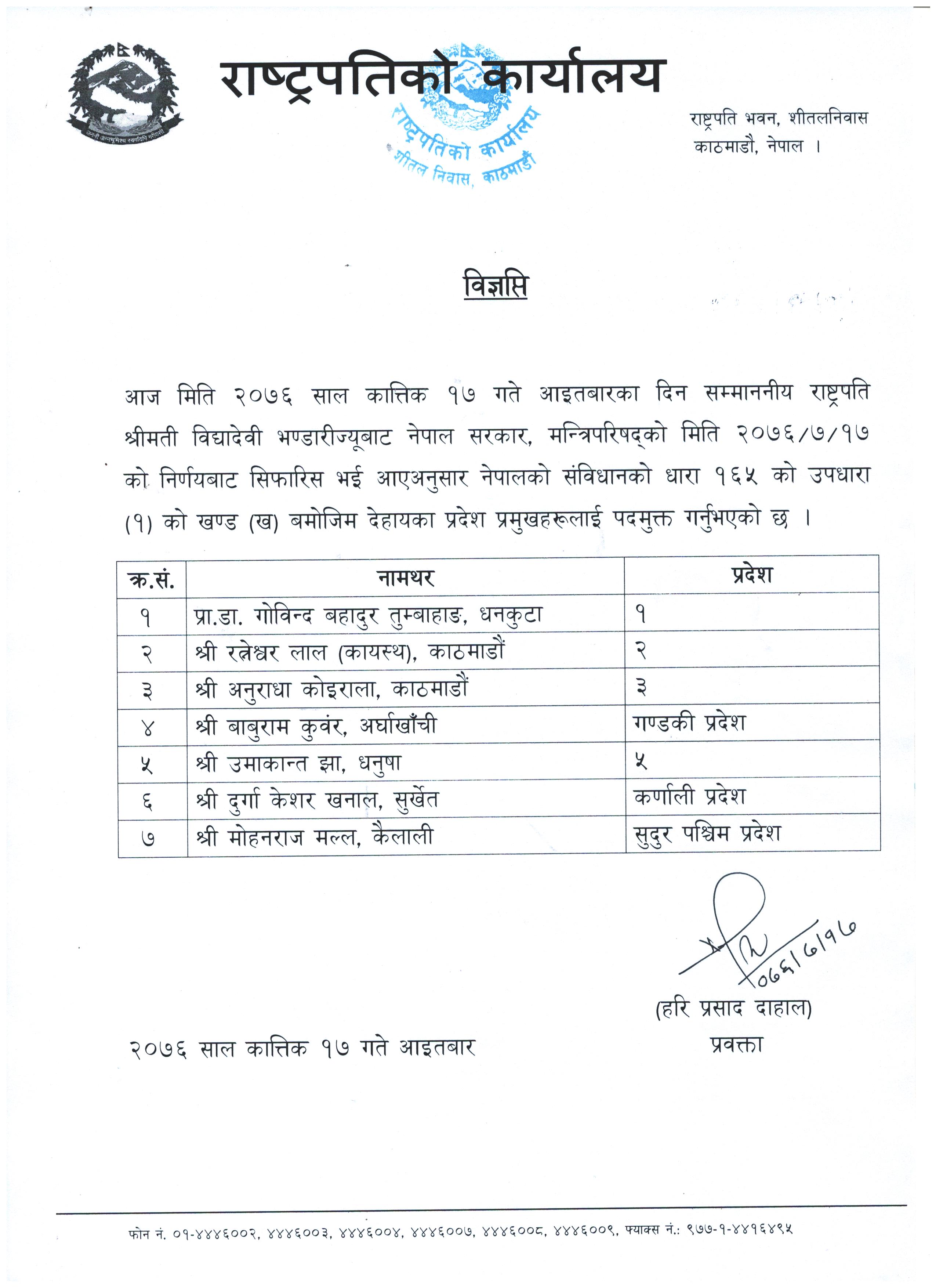 १७ कात्तिक, काठमाडौँ । राष्ट्रपति विद्यादेवी भण्डारीले मन्त्रिपरिषद्को सिफारिसमा सातै प्रदेशका प्रदेश प्रमुखलाई आज पदमुक्त गर्नुभएको छ । नेपालको संविधानको धारा १६५ को उपधारा (१) को खण्ड (ख) बमोजिम नेपाल सरकारको मन्त्रिपरिषद्को आजको निर्णयबाट प्रदेश प्रमुखहरुलाई पदमुुक्त गरिएको राष्ट्रपतिको कार्यालयले जनाएको छ । सो उपदफामा निजको पदावधि समाप्त भएमा वा सो अगावै राष्ट्रपतिले निजलाई पदमुक्त गरेमा प्रदेश प्रमुख पद रिक्त व्यवस्था छ ।