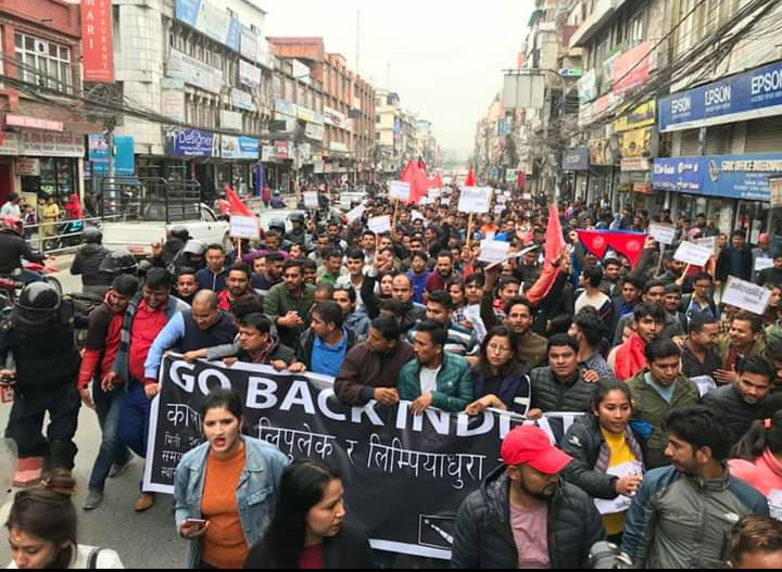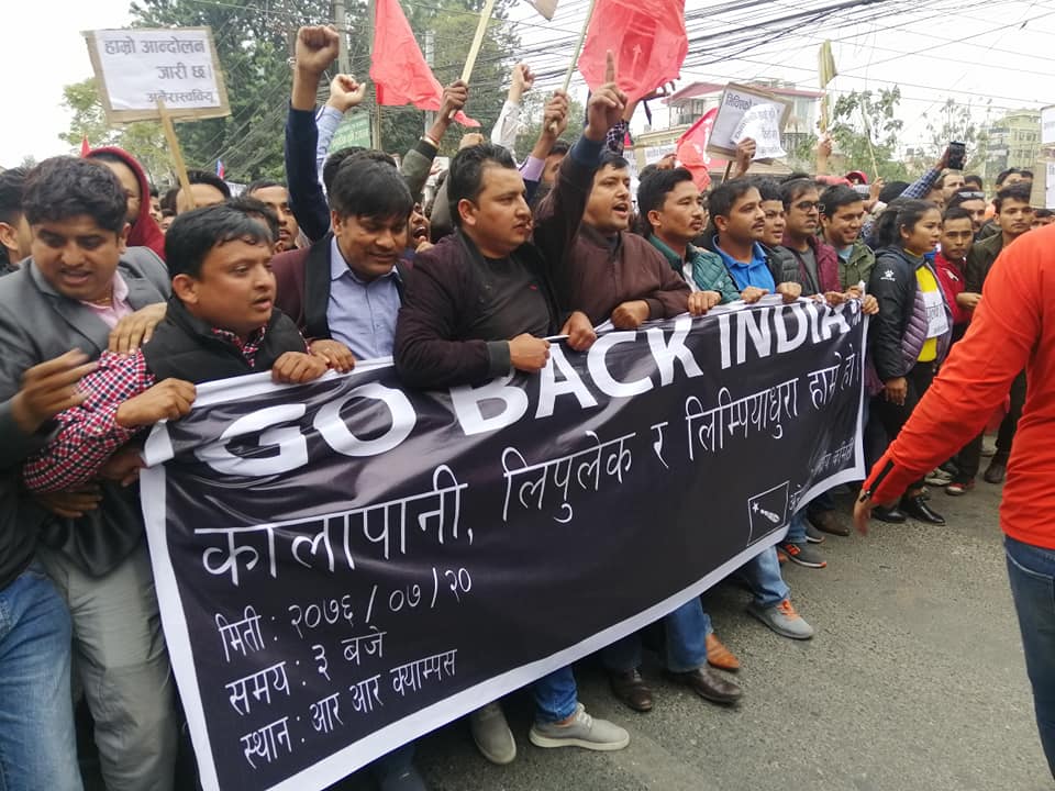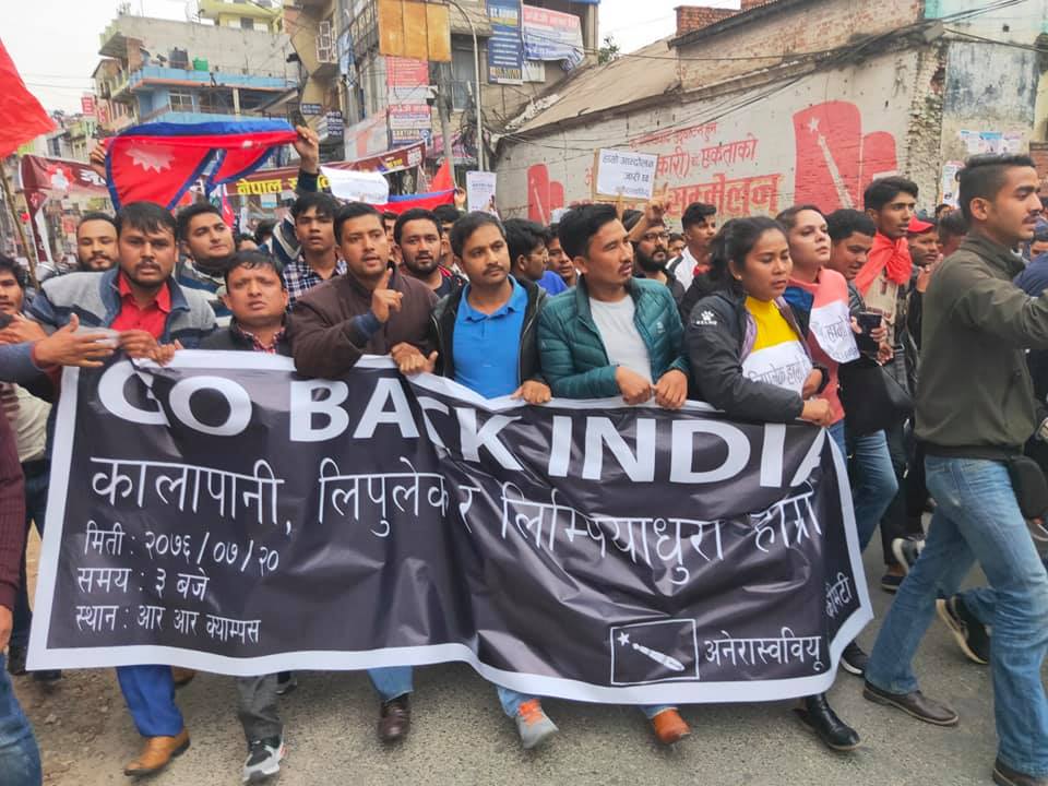 अनेरास्ववियुले गो ब्याक इन्डिया भन्दै हजारौँ विद्यार्थी बुधबार सडकमा उतारेको छ । नेपाली भूमि नेपालकै हुनेभन्दै देशैभर प्रदर्शन गरेको अनेरास्ववियुले काठमाडौँमा प्रदर्शनीमार्गबाट सुरु भएको जुलुस बागबजार हुँदै रत्नपार्कमा पुगेर कोण सभामा परिणत भएको थियो । जुलुसमा सहभागी नेता कार्यकर्ताले ब्याक अफ इण्डिया लेखेको प्ले कार्ड समेत बोकेका थिए ।