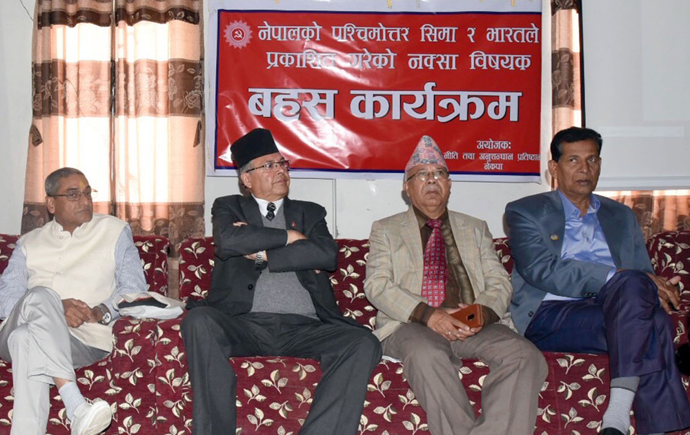 पूर्व प्रधानमन्त्रीसमेत रहनुभएका खनालले लिम्पियाधुराबाट निस्केको काली नदी नै भारतसँगको सीमा भएकामा दुईमत नरहेको उल्लेख गर्दै नेपालको वास्तविकता पश्चिम र दक्षिणको सीमा कहाँसम्म हो भनेर तथ्यगत ढङ्गबाट निक्र्यौल निकाल्नुपर्ने बताउनुभयो । कार्यक्रममा नेकपाका अर्का वरिष्ठ नेता माधवकुमार नेपालले मुलुकको राष्ट्रियतामा सबै राजनीतिक दल एक भएकाले कूटनीतिक तरिकाले समस्याको समाधान गर्नुपर्ने बताउनुभयो । “सर्वदलीय बैठकमा एकमत लिम्पियाधुराबाट निस्केको काली नदी नै नेपाल र भारतको सीमा हो, भारतले सार्वजनिक गरेको नयाँ नक्सामा नेपालको भूमि अतिक्रमण गरिएको भन्नेमा सबै दल एकमत भएका छन्”, उहाँले भन्नुभयो, “यस मामिलामा सिङ्गो राष्ट्र एकताबद्ध हुनुपर्दछ ।”
