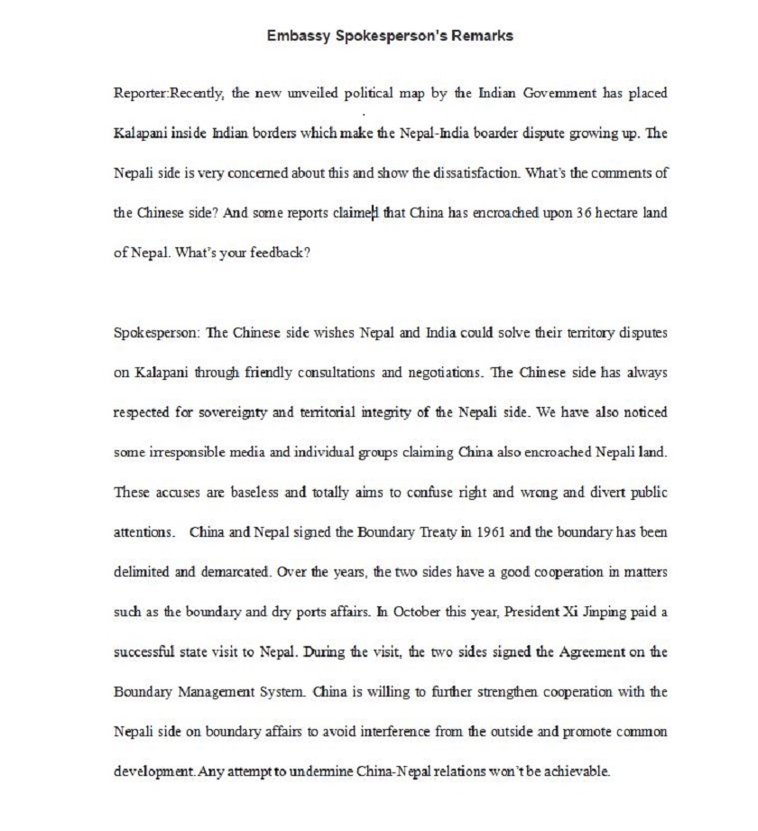 चिनियाँ राजदूतावासले जारी गरेको विज्ञप्तिमा कालापानी क्षेत्रको विवादलाई नेपाल र भारतले वार्ता गरी टुंग्याउनुपर्ने उल्लेख गरेको छ ।उसले कालापानी क्षेत्रको विवाद मैत्रीपूर्ण परामर्श र वार्ताका माध्यामबाट समाधान गर्ने सदिच्छा व्यक्त गरेको छ । दूतावासले केही मिडियाहरुले चीनप्रति लगाएको आरोपप्रति दुःख समेत व्यक्त गरेको छ । विज्ञप्तिमा भनिएको छ,‘ केही गैरजिम्मेवार व्यक्ति र मिडियाले चीनले नेपालको सीमा मिच्यो भनेको हामीले सुनेका छौं । यस्ता आरोप आधारहीन छन्। उनीहरूको उद्देश्य जनमानसमा के सत्य के गलत हो भ्रम पारेर जनताको ध्यान मोड्ने देखिन्छ।’ विज्ञप्तिमा वर्षौयता नेपाल र चीनबीच राम्रो सहकार्य हुँदै आएको समेत जनाइएको छ ।