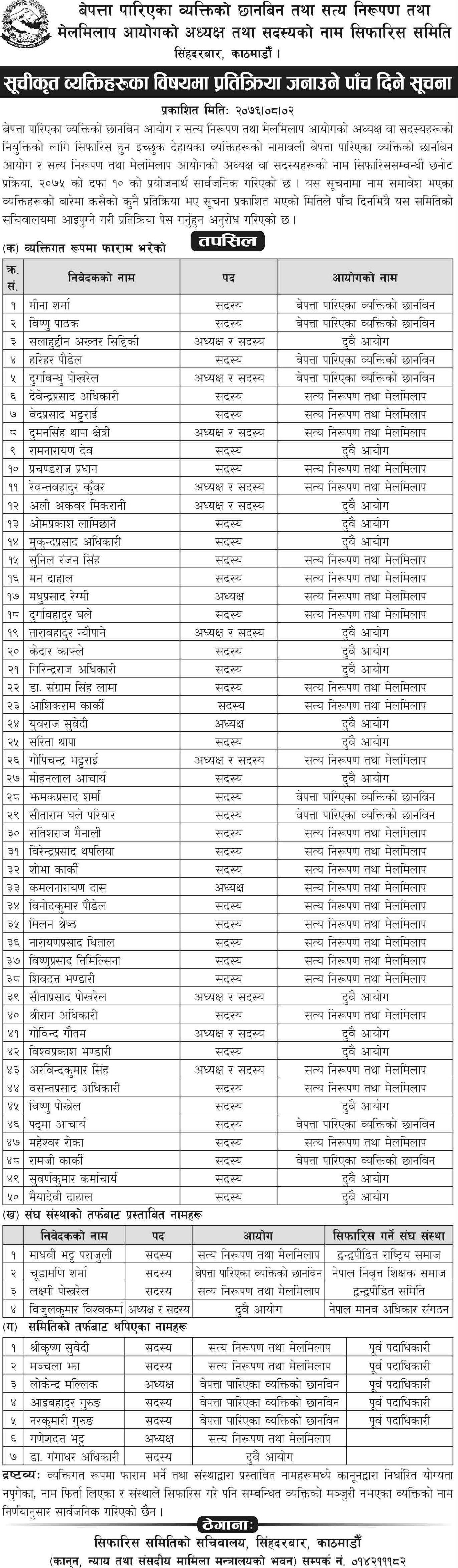 २ मंसिर, काठमाडौं । सत्य निरूपण तथा मेलमिलाप र बेपत्ता पारिएका व्यक्तिहरूको छानबिन आयोगमा सिफारिस गरिएका पदाधिकारीहरूको नाम सार्वजनिक भएको छ । पदाधिकारी चयन गर्न आइतबार बसेको सिफारिस समितिको बैठकले दुवै आयोगका अध्यक्ष तथा सदस्यमा सिफारिस ६१ जनाको नाम सार्वजनिक गरेको हो ।
