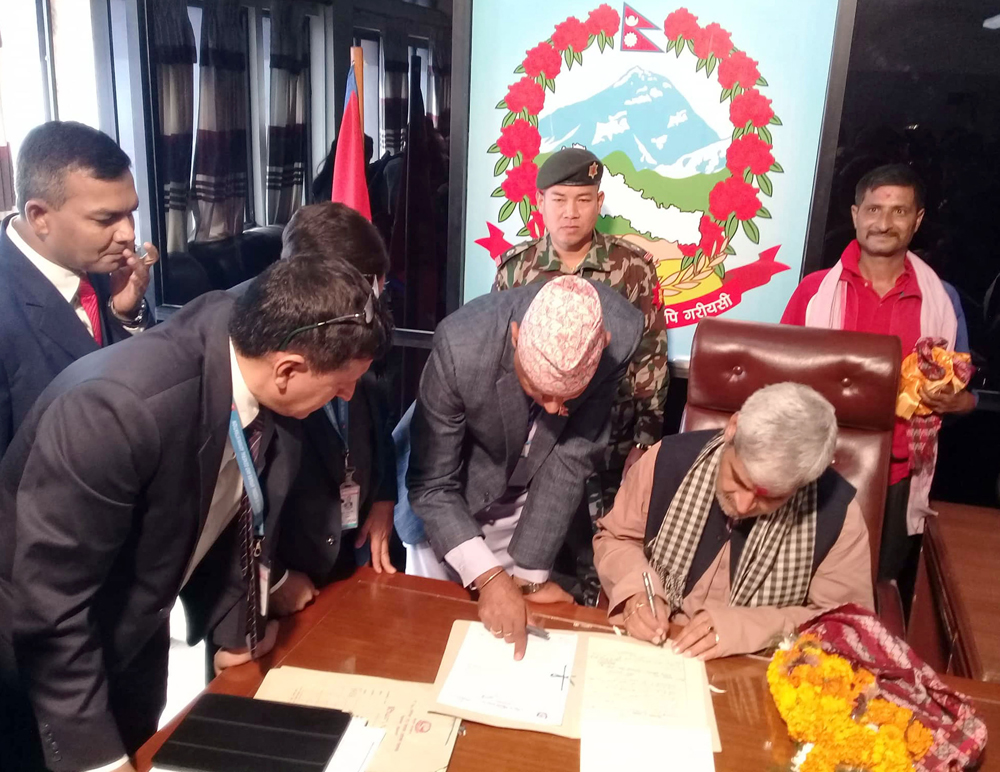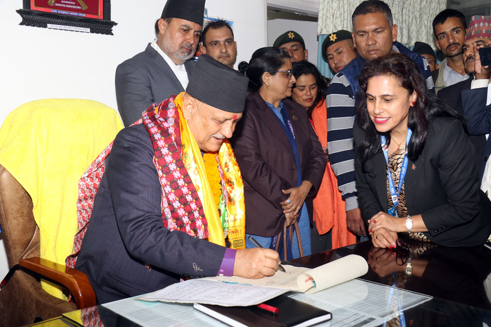 नवनियुक्त कृषि तथा पशुपन्छी विकासमन्त्री घनश्याम भुसाल बिहीबार मन्त्रालयमा पदभार ग्रहण गर्दै । तस्बिरः रोशन सापकोटा