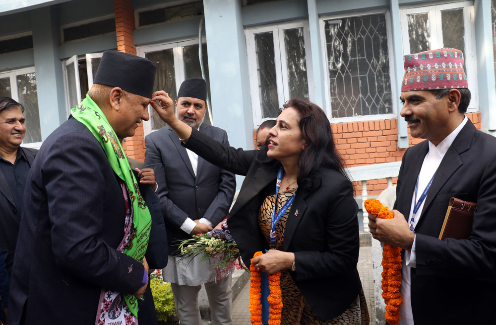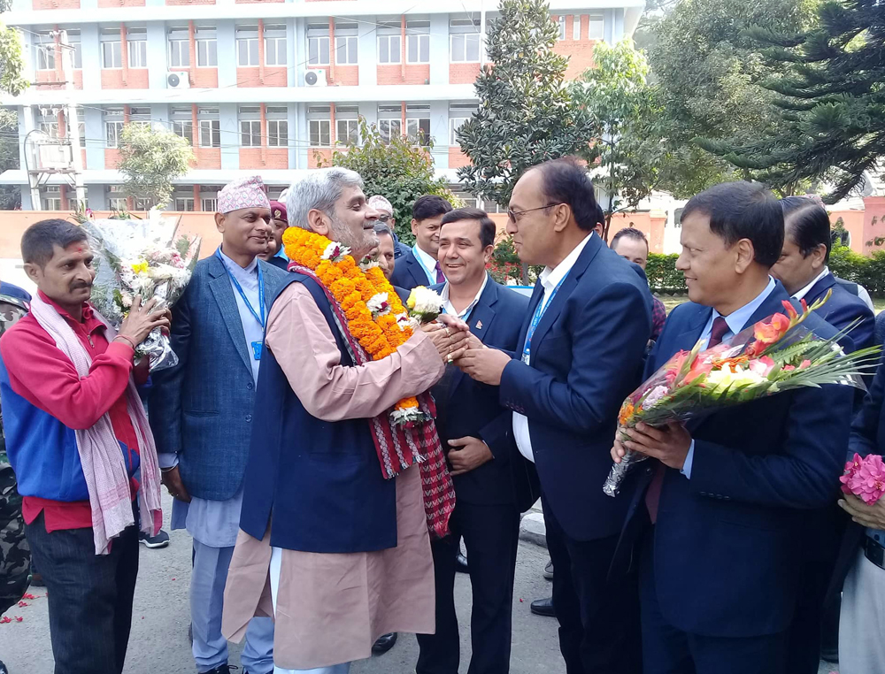 नवनियुक्त उद्योग, वाणिज्य तथा आपूर्तिमन्त्री लेखराज भट्टलाई मन्त्रालयमा बिहीबार स्ववागत गरिँदै । तस्बिरः रत्न श्रेष्ठ