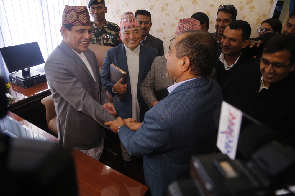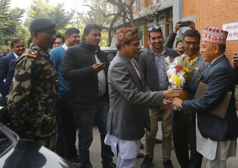 नवनियुक्त संघिय मामिला तथा सामान्य प्रशासनमन्त्री हृदयेश त्रिपाठी बिहीबार मन्त्रालयमा पदभार सम्हाल्दै । तस्वीरः नारायण ढुङगाना