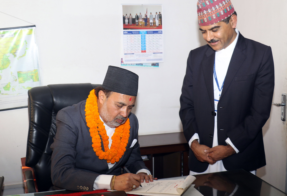 नवनियुक्त उद्योग, वाणिज्य तथा आपूर्तिमन्त्री लेखराज भट्ट बिहीबार मन्त्रालयमा कार्यभार सम्हाल्दै । तस्बिरः रत्न श्रेष्ठ