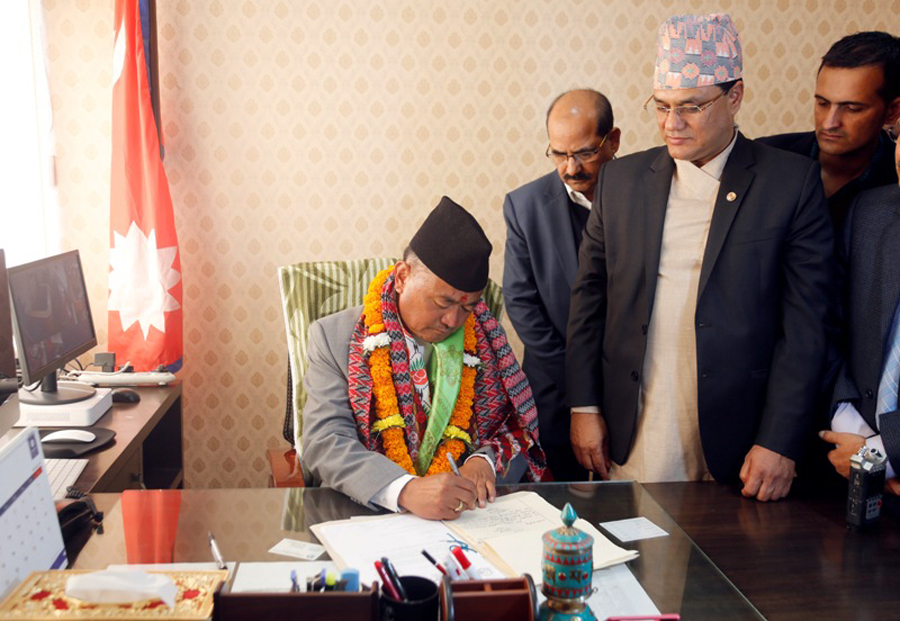 नवनियुक्त भौतिक पूर्वाधार तथा यातायातमन्त्री वसन्तकुमार नेम्वाङ बिहीबार मन्त्रालयमा कार्यभार सम्हाल्दै । तस्बिरः रोशन सापकोटा