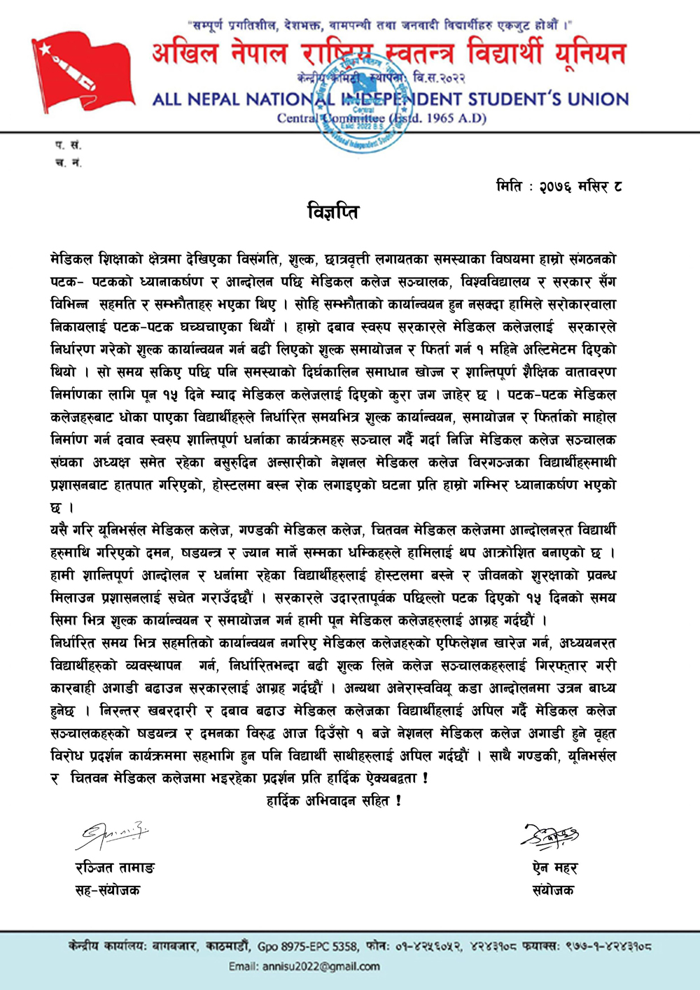 मेडिकल शिक्षाको क्षेत्रमा देखिएका विसंगति, शुल्क, छात्रवृत्ती लगायतका समस्याका विषयमा हाम्रो संगठनको पटक– पटकको ध्यानाकर्षण र आन्दोलन पछि मेडिकल कलेज सञ्चालक, विश्वविद्यालय र सरकार सँग विभिन्न सहमति र सम्झौताहरु भएका थिए । सोहि सम्झौताको कार्यान्वयन हुन नसक्दा हामिले सरोकारवाला निकायलाई पटक–पटक घच्घचाएका थियौं । हाम्रो दबाव स्वरुप सरकारले मेडिकल कलेजलाई सरकारले निर्धारण गरेको शुल्क कार्यान्वयन गर्न बढी लिएको शुल्क समायोजन र फिर्ता गर्न १ महिने अल्टिमेटम दिएको थियो । सो समय सकिए पछि पनि समस्याको दिर्घकालिन समाधान खोज्न र शान्तिपूर्ण शैक्षिक वातावरण निर्माणका लागि पून १५ दिने म्याद मेडिकल कलेजलाई दिएको कुरा जग जाहेर छ ।