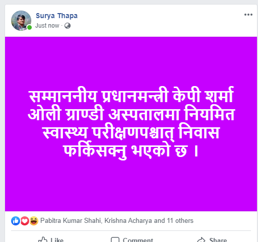 प्रधानमन्त्री स्वास्थ्य परीक्षणपछि केहीबेर अघि निवास फर्किएको प्रधानमन्त्रीका प्रेस सल्लाहकार सूर्य थापाले जानकारी दिए ।यसअघि गत कात्तिक १४ गते सोही अस्पतालमा प्रधानमन्त्री ओलीले स्वास्थ्य उपचार गराएका थिए । प्रधानमन्त्रीले मिर्गाैला प्रत्यारोपणको तयारी गरेका छन ।