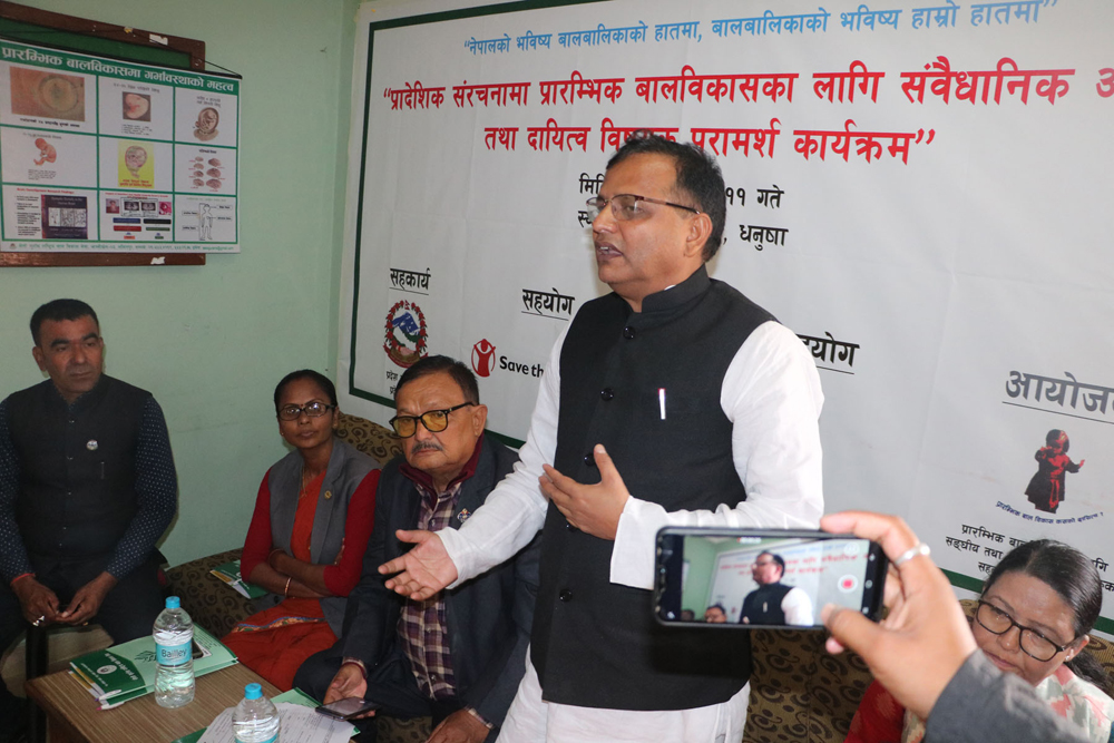 ११ मंसिर, धनुषा । मुख्यमन्त्री लालबाबु राउतले प्रारम्भिक बालविकासको प्रभावकारी कार्यान्वयनको लागि प्रदेशमा बाध्यकारी कानून बनाइने बताउनुभएको छ । प्रारम्भिक बालविकासको लागि प्रदेशसभा सदस्यको समन्वय समूहले आज जनकपुरमा आयोजना गरेको प्रादेशिक संरचनामा प्रारम्भिक बालविकासको लागि संवैधानिक अधिकार तथा दायित्व विषयक परामर्श कार्यक्रमको उद्घाटन गर्नुहुँदै मुख्यमन्त्री राउतले सो कुरा बताउनुभएको हो ।