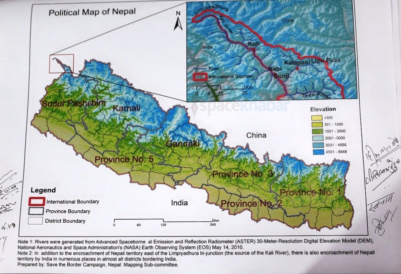 १३ मंसिर, काठमाडौं । नेपाली भूभाग लिम्पियाधुरा-कालापानी क्षेत्र समेटेर भारतले जारी गरेको नयाँ नक्साले सामाजिक तथा राजनीतिक तरङ्ग ल्याएको छ । नेपालले नक्साका विषयलाई लिएर कूटनीतिक माध्यमबाट भारत सरकारलाई असन्तुष्टि जनाउ दिइसकेको छ ।