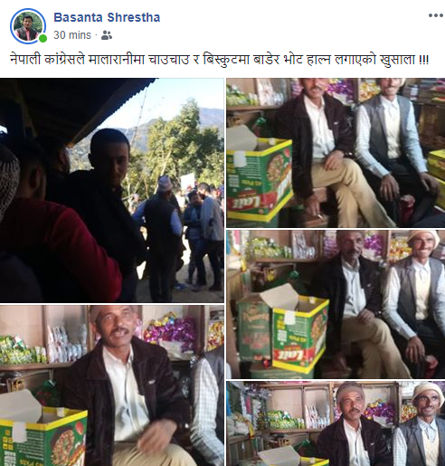 उनले कांग्रेसका नेता कार्यकर्ताले मतदातालाइ चाउचाउ र विस्कुट बाँडिरहेको बताएका छन । उनले दैनिकीसँग कुरा गर्दै उम्मेदवारको अनुरोधमा रूखमा मतदान गर्नेलाइ पसलबाट सिधै मतदातालाइ चाउचाउ र बिस्कुट बाँड्नेकाम भएको बताए । मलारानी ३ मा कांग्रेसबाट शोभाकर खनाल, नेकपाबाट यमलाल खनाल र राप्रपाबाट रणबहादुर खनाल उम्मेदवार रहेका छन । तत्कालीन वडा अध्यक्ष जीवन चौहानको मोटरसाइकल दुर्घटनामा परी निधन भएपछि सोही वडामा शनिबार मतदान भैरहेको छ । तस्बीरहरूः बसन्त श्रेष्ठ/पत्रकार