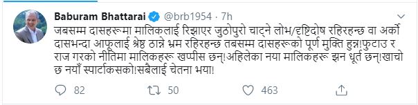 सत्ता साझेदार आफ्नो दललाई छाडेर नेकपाले राजपासँग सहमति गरेपछि बाबुरामले ट्विटरमा लेखेका छन्ः ‘जबसम्म दासहरूमा मालिकलाई रिझाएर जुठोपुरो चाट्ने लोभ/दृष्टिदोष रहिरहन्छ वा अर्को दासभन्दा आफूलाई श्रेष्ठ ठान्ने भ्रम रहिरहन्छ तबसम्म दासहरूको पूर्णमुक्ति हुन्न!फुटाउ र राज गरको नीतिमा मालिकहरू खप्पीस छन् !अहिलेका नयाँ मालिकहरू झन धूर्त छन् ! खाचो छ नयाँ स्पार्टाकसको ! सबैलाई चेतना भया !’