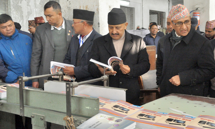 २२ पुस, भक्तपुर । शिक्षा, विज्ञान तथा प्रविधिमन्त्री गिरिराजमणि पोखरेलले आज भक्तपुरको सानोठिमीस्थित जनक शिक्षा सामग्री केन्द्र लिमिटेडमा पुगेर पाठ्यपुस्तक छपाइको अनुगमन गर्नुभएको छ । शिक्षा सचिव महेश दाहाल, शिक्षा तथा मानव स्रोत विकास केन्द्रका महानिर्देशक बाबुराम भट्टराई लगायतको टोलीले केन्द्रले आगामी शैक्षिक सत्र २०७७ का लागि आवश्यक रङ्गीन पाठ्यपुस्तक छपाइको अनुगमन गरेको हो ।