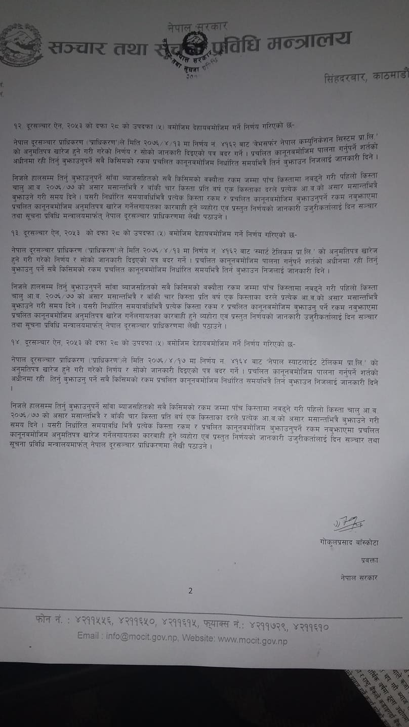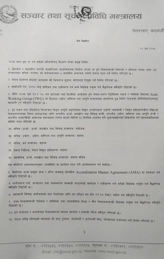 २४ पुस, काठमाडौँ । गत पुस २१ गते बसेको मन्त्रिपरिषद् बैठकको निर्णय सार्वजनिक भएको छ । सूचना तथा संचार प्रविधिमन्त्री गोकुल प्रसाद बाँस्कोटाले बिहीबार मन्त्रालयमा पत्रकार सम्मेलन गरी निर्णय सार्वजनिक गरेका हुन् ।