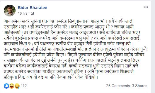 बिहीबार नेकपाका स्थानीय नेता विदुर भारतीले प्रचण्डले कार्यकर्ता भेट्न नपाएको र आगामी निर्वाचनमा नेकपाले वडामै चुनाव हार्ने चेतावनी दिएका छन । फुलमाला लिएर बसेका कार्यकर्ताले अध्यक्ष प्रचण्डलाइ भेट्न नपाएपछि प्रधानपञ्चको घरमा रहेको कुकुर हेरेर फर्किएको उनले उल्लेख गरेका छन ।