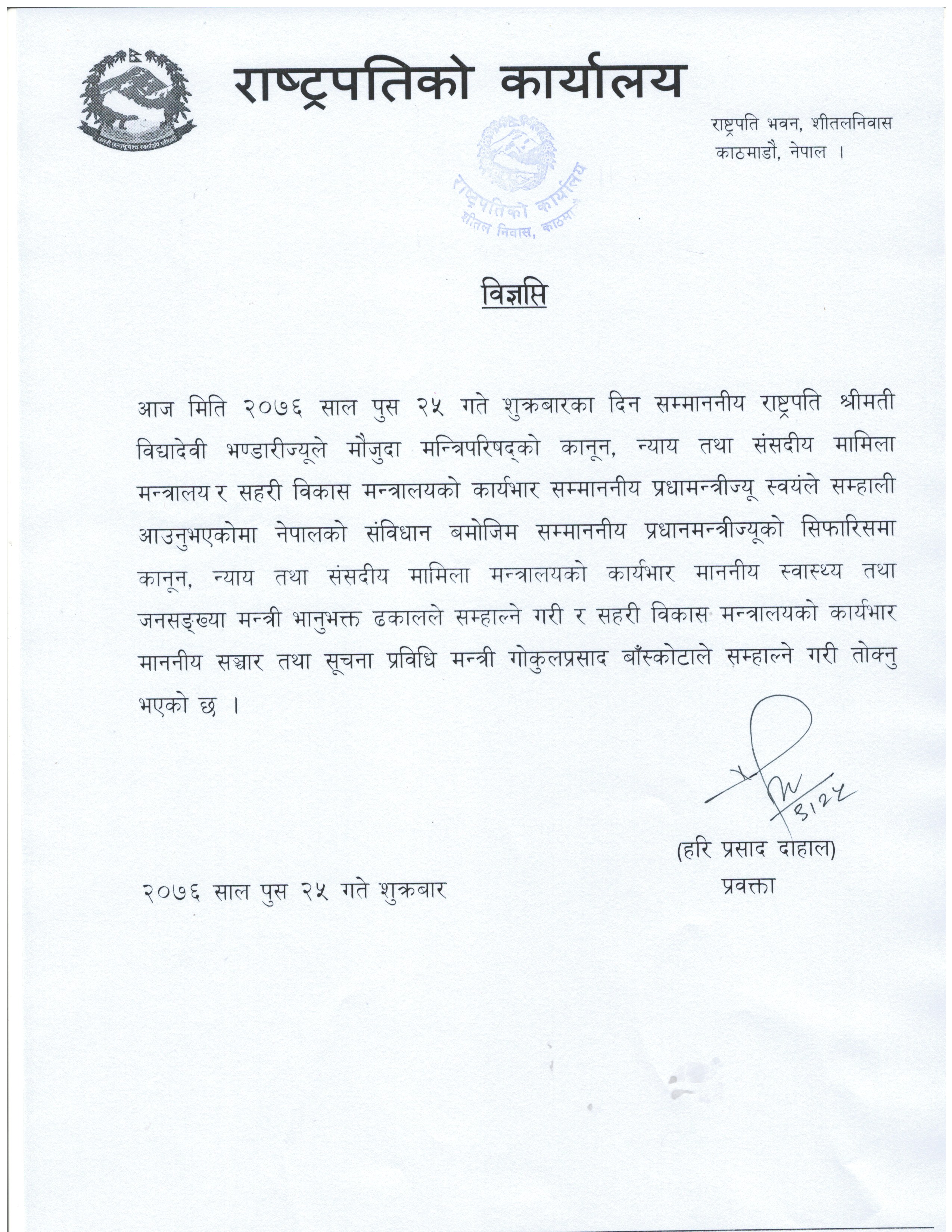२५ पुस, काठमाडौँ । राष्ट्रपति विद्यादेवी भण्डारीले प्रधानमन्त्री केपी शर्मा ओलीको सिफारिसमा सहरी विकास मन्त्री र कानुनमन्त्रीको जिम्मेवारी गोकुल बास्कोटा र भानुभक्त ढकाललाइ तोक्नु भएको छ । राष्ट्रपति भण्डारीले सञ्चार तथा सूचना प्रविधिमन्त्री गोकुल बाँस्कोटालाइ सहरी विकास मन्त्रालयको जिम्मेवारी र स्वास्थ्यमन्त्री भानुभक्त ढकाललाइ कानुन मन्त्रालयको जिम्मेवारी बहन गर्ने गरी तोक्नु भएको छ ।
