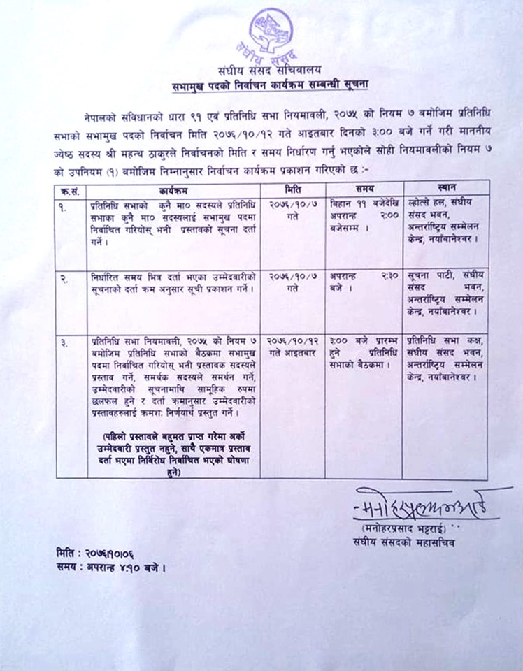 हिजो अपराह्न ४ बजे बसेको प्रतिनिधिसभा दोस्रो बैठकले रिक्त सभामुख पदको निर्वाचन कार्यतालिका सार्वजनिक गरेको हो ।