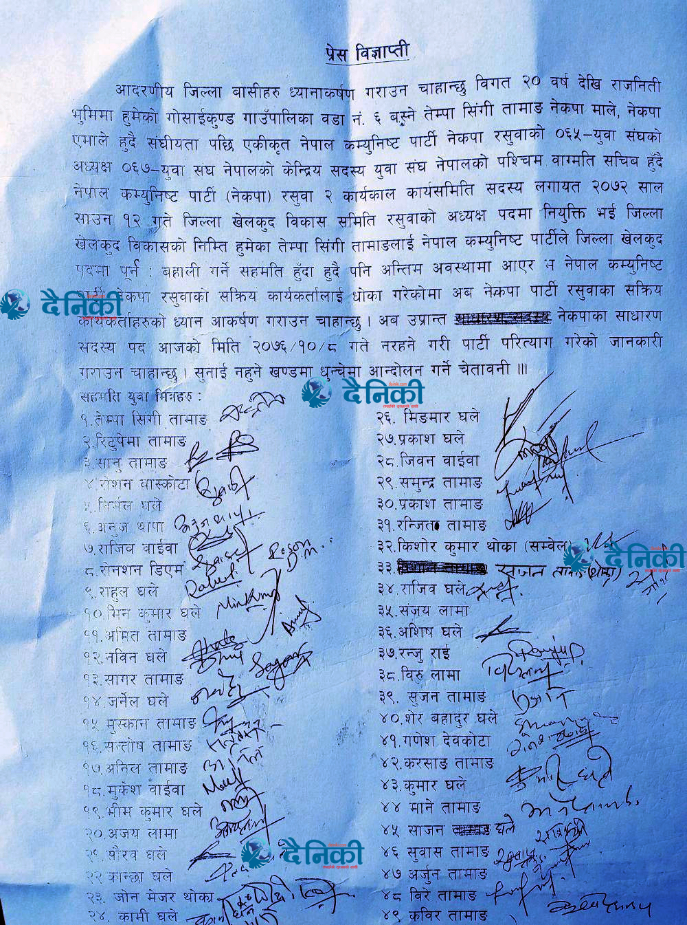 नेकपा रसुवाका ५० जनाले पार्टी परित्या गरेका छन् । खेलकुद विकास समितिमा एकलौटी ढंगले नियुक्ति गरेको भन्दै नेकपा कार्यकर्ताले बुधबार पार्टी परित्याग गरेका हुन् । तत्कालीन माओवादीका दावा तामाङलाइ जिल्ला खेलकुद विकास समिति रसुवाको अध्यक्ष पदमा नियुक्त गरेपछि ४९ जनाले राजिनामा दिएका हुन । पार्ठीबाट राजिनामा दिने नेकपाका कार्यकर्ताहरूको सूची र विज्ञप्ति तल हेर्न सक्नुहुन्छ ।