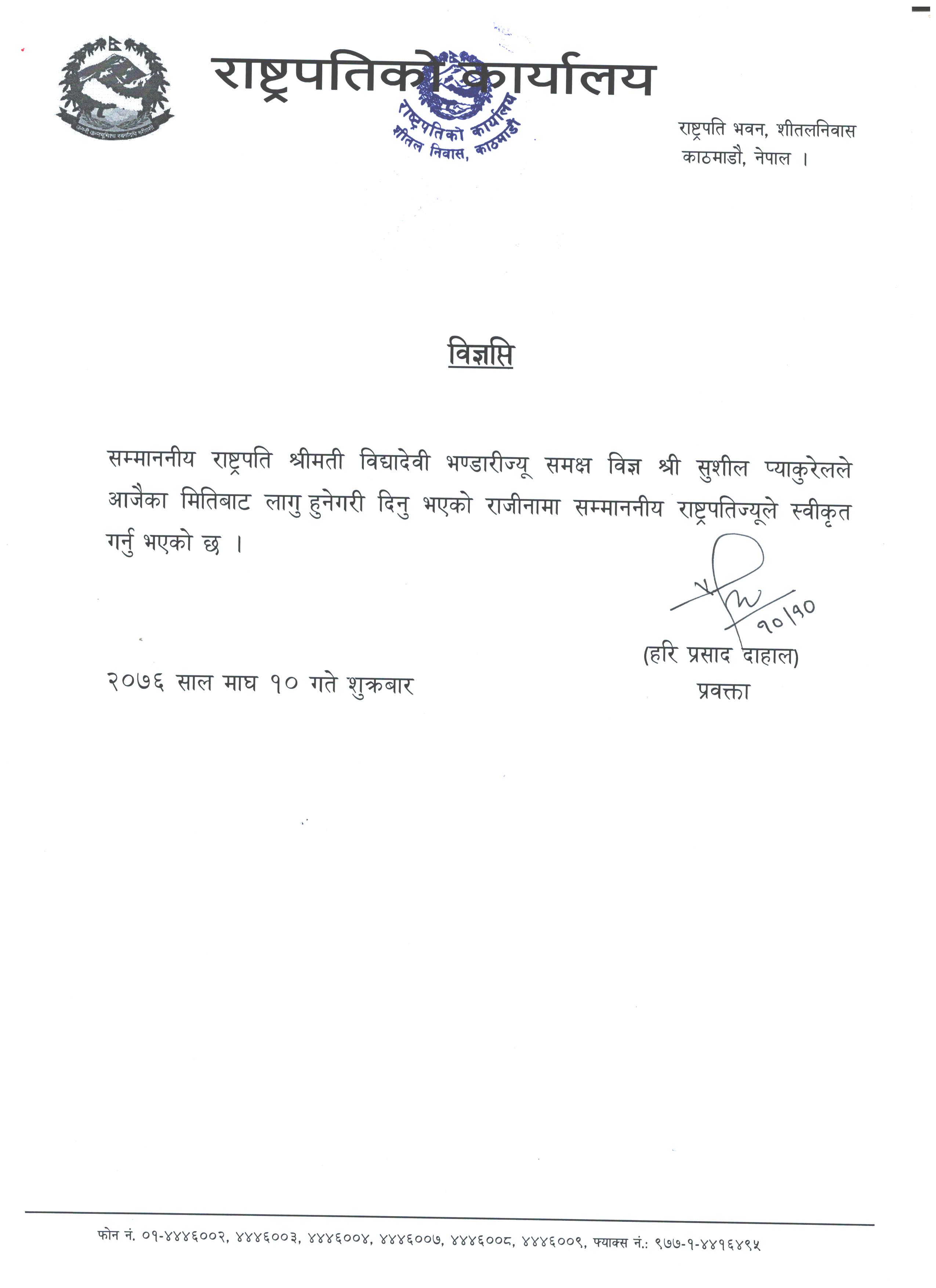 १० माघ, काठमाडौँ । विज्ञ सल्लाहकार सुशील प्याकुरेलले दिएको राजीनामा राष्ट्रपति विद्यादेवी भण्डारीले शुक्रबार स्वीकृत गरेकी छन् ।राष्ट्रपति भण्डारीले प्याकुरेलले दिएको राजीनामा शुक्रबार स्वीकृत गरेको राष्ट्रपति कार्यालयका प्रवक्ता हरिप्रसाद दाहालले जानकारी दिए ।