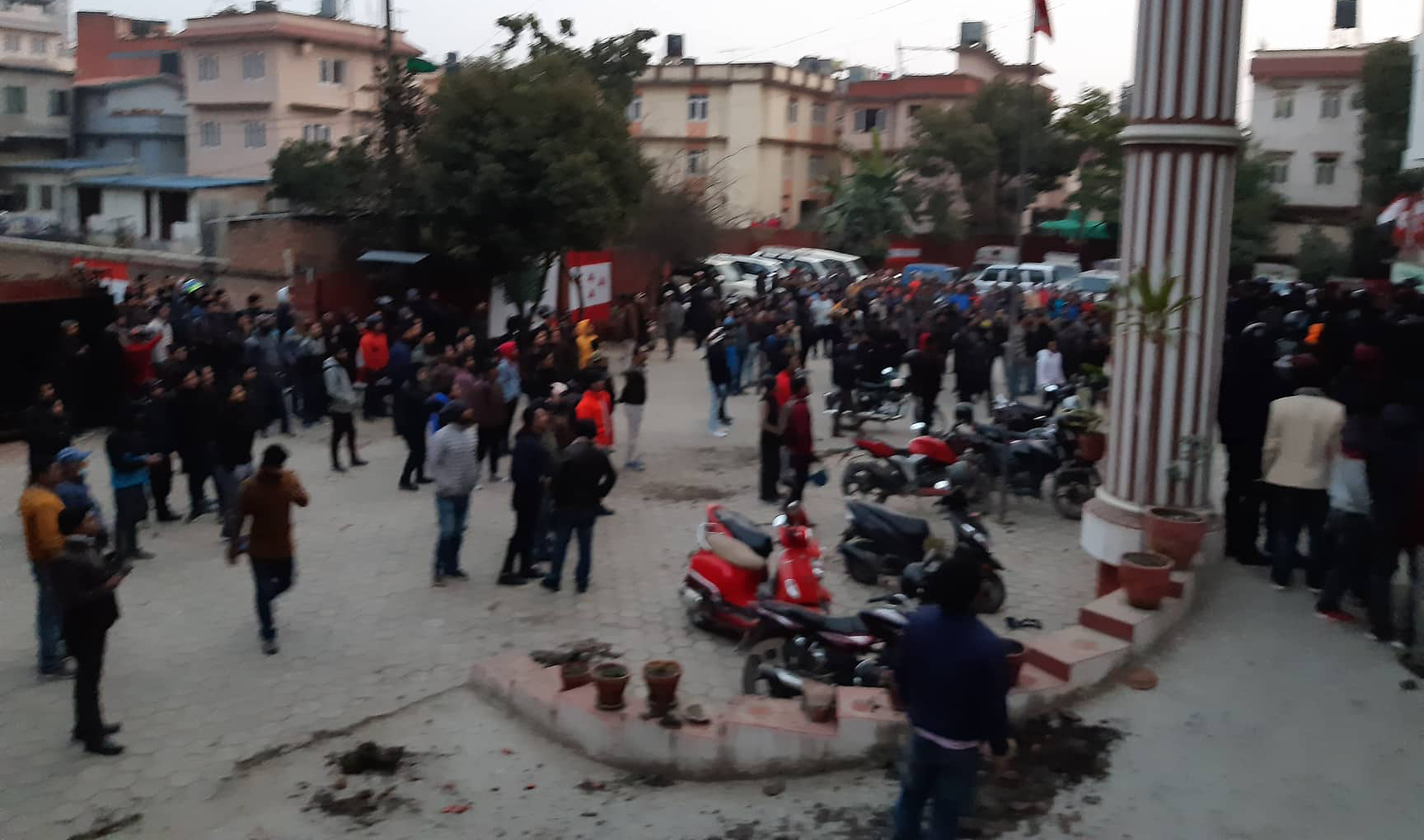 दिउँसो कुस्ती खेलेका विद्यार्थी नेताहरूको बीचमा साँझ फेरि झडप भएको छ । सभापति शेरबहादुर देउवा निकटका नेविसंघका कार्यकर्ता र नेविसंघभित्र ३२ वर्षमुनीको नेतृत्व हुनुपर्ने पक्षमा रहेका कार्यकर्ताबीच झडप भएको हो । पछिल्लो झडपमा दर्जन बढी नेविसंघका कार्यकर्ता घाइते भएका छन् । यस्तै झडपका क्रममा बैठकमा सहभागी हुन पुगेका नेताहरुको गाडी समेत तोडफोड भएको छ।