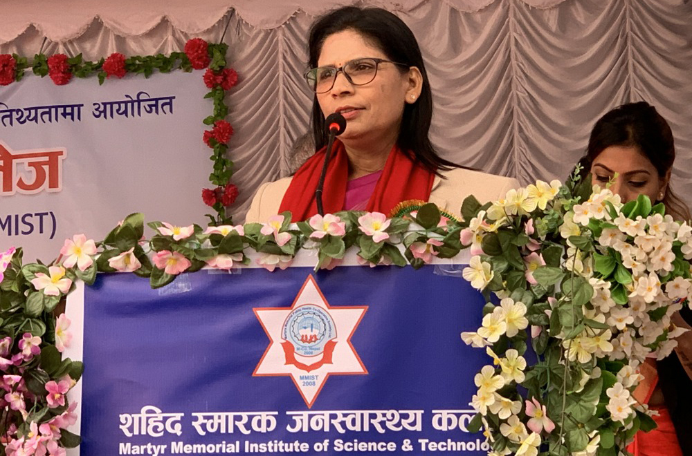 १७ माघ, काठमाडौँ । भूमि व्यवस्था, सहकारी तथा गरिबी निवारण मन्त्री पद्माकुमारी अर्यालले नेपाली माटोमा सुन फलाउन सक्ने जनशक्ति उत्पादनतर्फ लाग्नुपर्ने बताउनुभएको छ । शहिद स्मारक जनस्वास्थ्य कलेज सिफलको ११ औं वार्षिकोत्सवको अवसरमा आज शुक्रबार काठमाडौंमा सम्बोधन गर्दै मन्त्री अर्यालले त्यस्तो बताउनुभएको हो ।