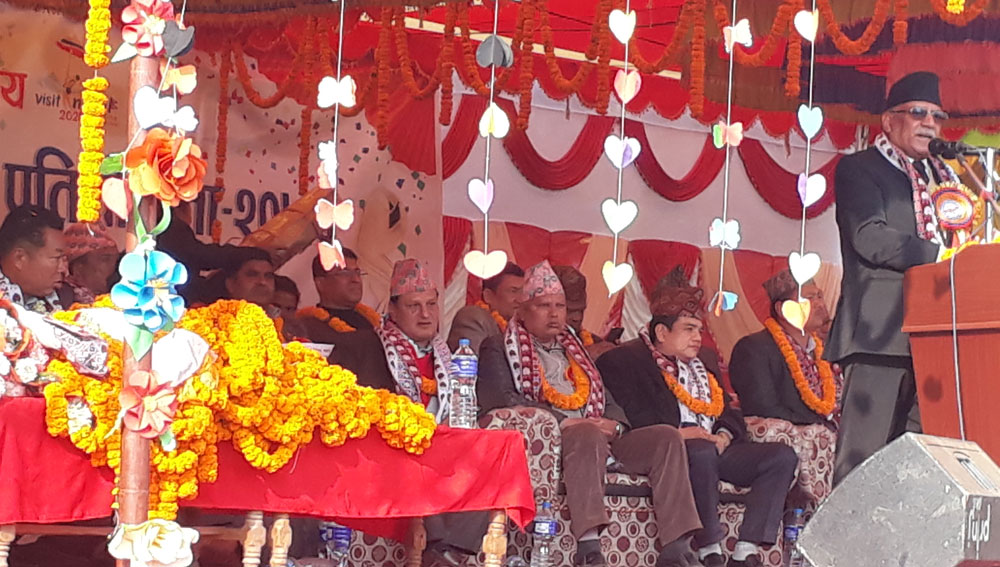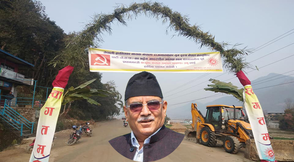नुवाकोटमा नेकपाका नेता कार्यकर्ता स्वागत गेट बनाएर कुरे, प्रचण्ड हेलिकप्टरमा उडे