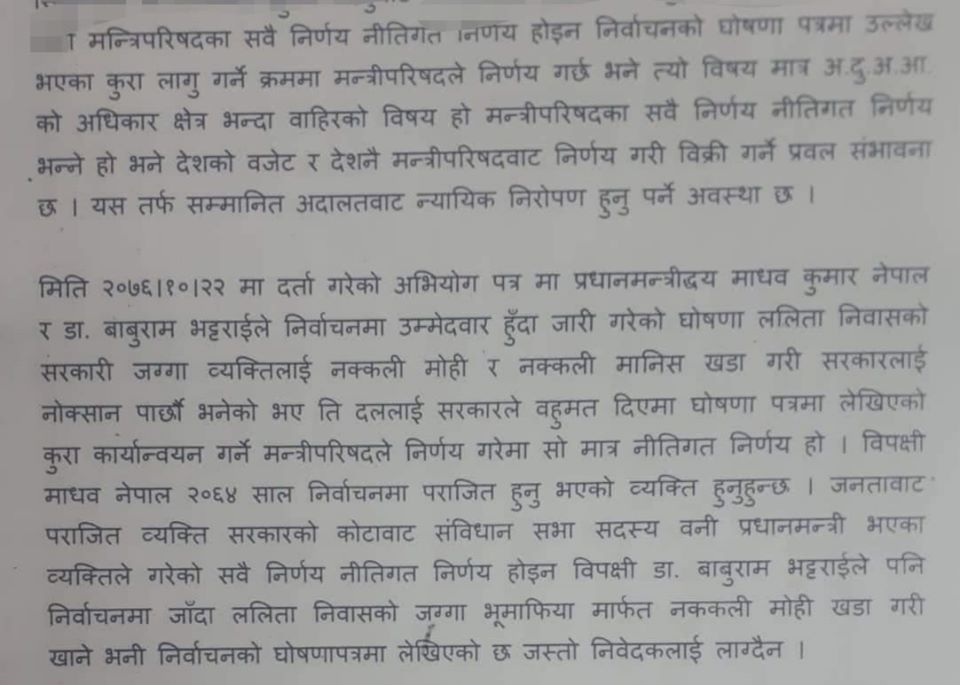 अख्तियार दुरूपयोग अनुसन्धान आयोगले गरेको व्याख्या गलत भएको भन्दै वरिष्ठ अधिवक्ता बालकृष्ण न्याैपानेले सर्वोच्चमा रिट निवेदन दिएका हुन । उनले रिटमा मन्त्रिपरिषद्को सबै निर्णय नीतिगत नहुने दलिल पेश गरेका छन । न्यौपानेले सरकारी जग्गा व्यक्तिको नाममा सार्ने निर्णय गर्ने मन्त्रिपरिषदका प्रधानमन्त्रीसहित सबै मन्त्रीलाई भ्रष्टाचार मुद्दा लगाउनुपर्ने दाबी गरेका छन ।