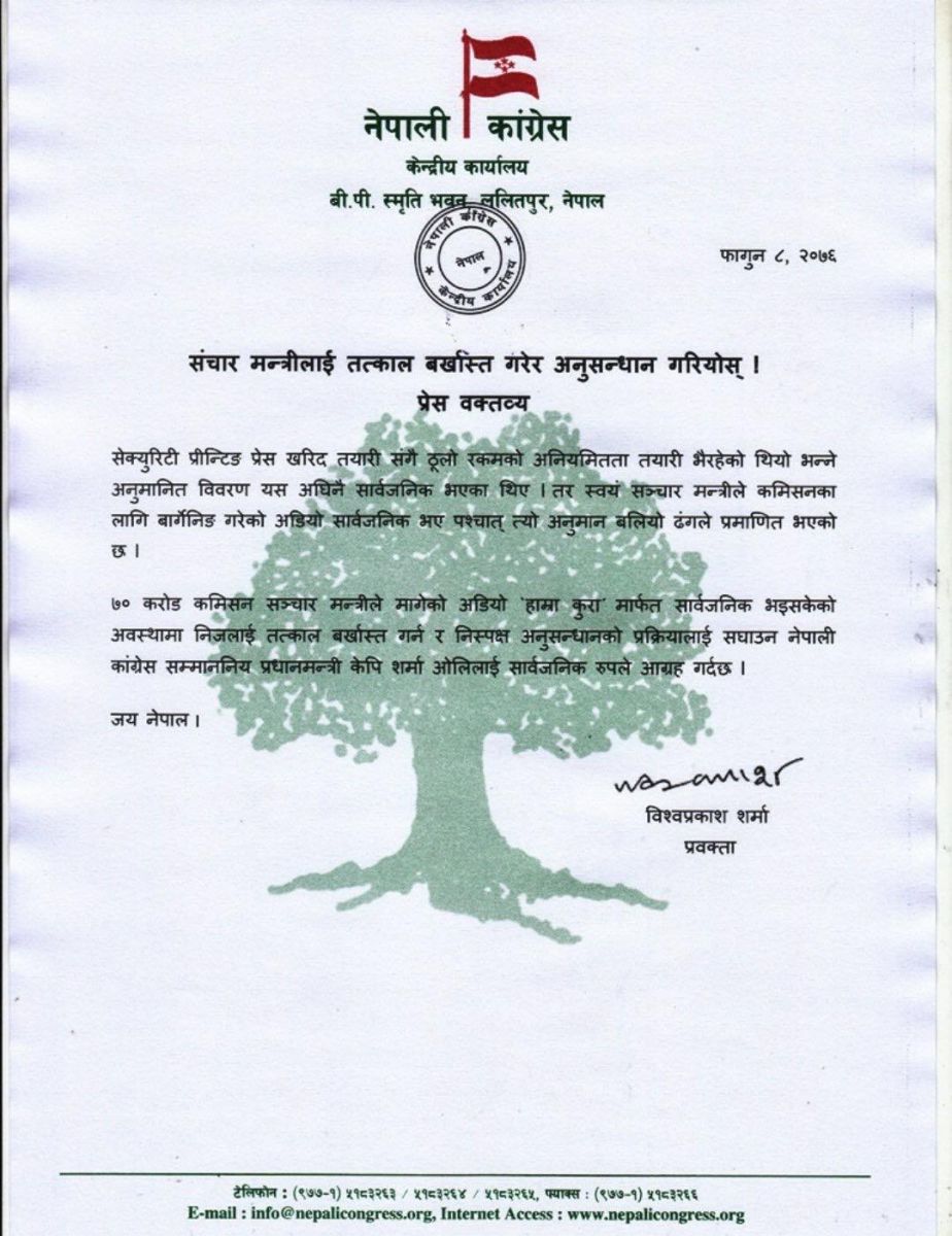 सञ्चारमन्त्रीलाई तत्काल बर्खास्त गर्न कांग्रेसको माग (विज्ञप्तिसहित)