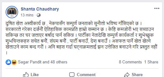 सचेतक चाैधरीले अघि लेखेकी छिन ‘पार्टीका नेतादेखि सम्पुर्ण कार्यकर्ता र शुभेच्छुक शुभचिन्तकहरु सचेत बनौं, संयम बनौं , पार्टी बनाउँ, देश बनाउँ । असफल पार्ने खेल खेल्ने खेलाउने काम बन्द गरौं । अनि बहस गर्दा घट्नाक्रमलाई झन उत्तेजित बनाउने गरि प्रस्तुत नहौं ।’ उनले पार्टी भित्रको कुरामा बहस गर्न सकिने तर घट्नाक्रमलाई झन उत्तेजित बनाउने गरि प्रस्तुत हुन नहुनेब ताएकी छिन ।