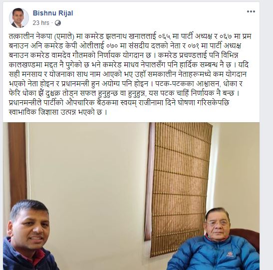 नेकपाका केन्द्रीय सदस्य रिजालले फेसबुकमा लेखेको टिप्पणी