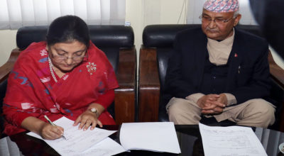 १३ माघ, काठमाडौं । राष्ट्रपति विद्यादेवी भण्डारी र प्रधानमन्त्री केपी शर्मा ओलीबीच आइतबार राष्ट्रपति भवन, शीतलनिवासमा