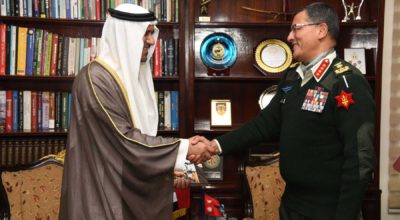 ९ मंसिर, काठमाडौँ । प्रधानसेनापति पूर्णचन्द्र थापासँग यहाँस्थित संयुक्त अरब इमिरेट्सका राजदूत सइद हमदान अल