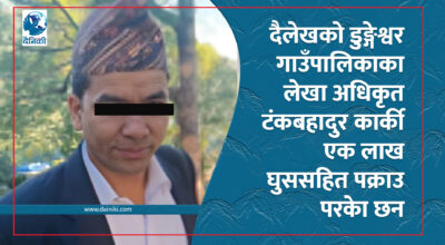 ३ असोज, काठमाडाैँ । दैलेखको डुङ्गेश्वर गाउँपालिकाका लेखा अधिकृत टंकबहादुर कार्की घुससहित पक्राउ परेका छन् ।