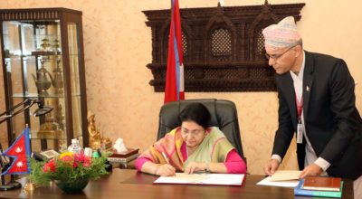 २४ असोज, काठमाडौँ । राष्ट्रपति विद्यादेवी भण्डारीले सङ्घीय संसद्को दुवै सदनबाट पारित तीन विधेयक आज