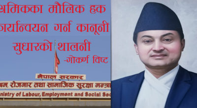 १८ वैशाख, काठमाडाैँ । श्रम, रोजगार तथा सामाजिक सुरक्षामन्त्री गोकर्ण विष्टले संविधानमा उल्लिखित श्रमिकका मौलिक