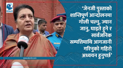 ३ असोज, काठमाडौँ। पूर्वराष्ट्रपति विद्यादेवी भण्डारीले जेनजी पुस्ताको शान्तिपूर्ण आन्दोलनमा गोली चल्नु, ज्यान जानु, घाइते