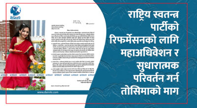 ३ असोज, काठमाडाैँ । राष्ट्रिय स्वतन्त्र पार्टी (रास्वपा)को नेता तोसिमा कार्कीले पार्टीको हाअधिवेशन र सुधारात्मक