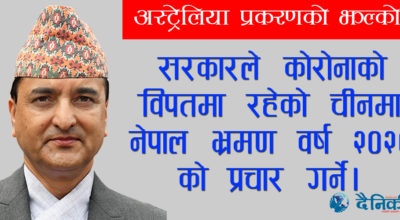 ७ फागुन, काठमाडौँ । नेपाल सरकारले कोरोनाको पीडामा रहेको चीनमा नेपाल भ्रमण वर्ष २०२० (भिजिट