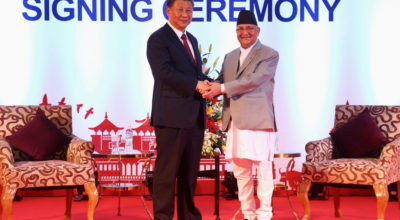२६ असोज, काठमाडौँ । चीनका राष्ट्रपति सी चीनफिङ र प्रधानमन्त्री केपी शर्मा ओलीको उपस्थितिमा नेपाल