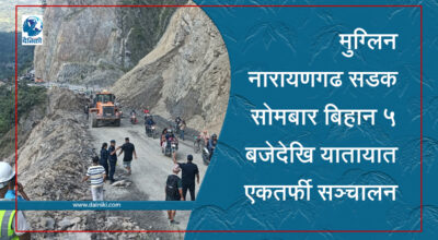 ६ असोज, भरतपुर । गएरातभर बन्द गरिएको मुग्लिन–नारायणगढ सडक आज बिहान ५ बजेदेखि यातायात एकतर्फी