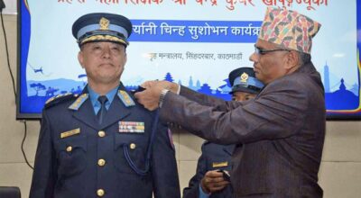 १९ भदौ, काठमाडौँ । नवनियुक्त प्रहरी महानिरीक्षक चन्द्रकुवेर खापुङले आज दर्ज्यानी चिन्ह् लगाउनुभएको छ ।